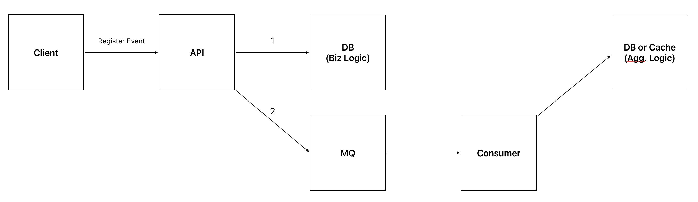 Solution 1. DB 테이블에 집계 정보를 저장할 컬럼 또는 테이블을 만들고 집계 대상 이벤트(추가, 수정, 삭제등)가 인입됐을때 비즈니스 로직(Query)을 처리하는 트랜잭션 말미에 집계를 저장하는 Query를 실행하는 방법이다. DB 관점에서는 아래처럼 순차적으로 실행될 것이다.