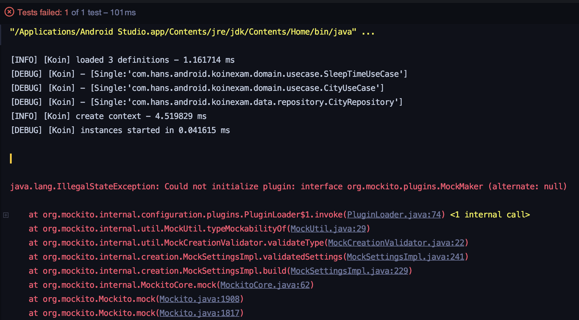 뭐가 잘못된 걸까? 에러의 내용은 아래와 같습니다. 내용인 즉슨, 'MockMaker 플러그인을 초기화할 수 없습니다.' Mockito를 사용하기 위해서 뭔가를 해줘야 하는 모양입니다.
